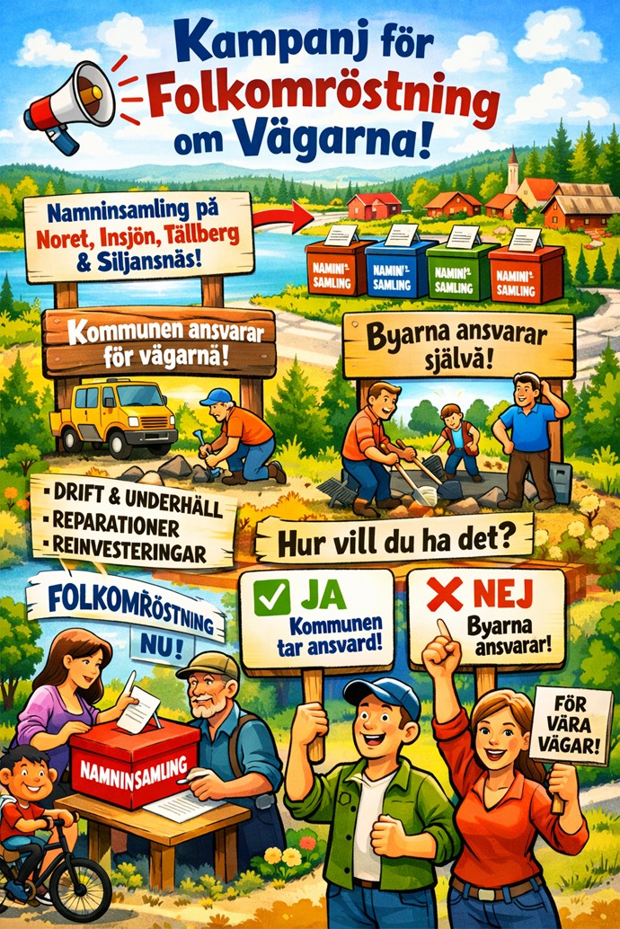 Jag stöder initiativet att hos Leksands Kommun begära folkomröstning om: att de enskilda vägarna inom och mellan byarna erbjuds att omgående intas i kommunal väghållning (drift, underhåll, reparationer och reinvestering) via regelverk och avtal. Lämna in namnunderskrifter senast 2026-03-25. Här kan du ladda ner för utskrift - 1. Namninsamlingen med text för folkomröstningen och 2. Namninsamlingen med många rader för dig som vill samla in namn. 3. Juridisk bedömning att Bysamfällighet bildad enligt äldre lag kan förvaltas av byamän som tillsätts på bystämma. 4. Öppet brev till alla partier - fullmäktigeberedningen i vägfrågan och inför valet.